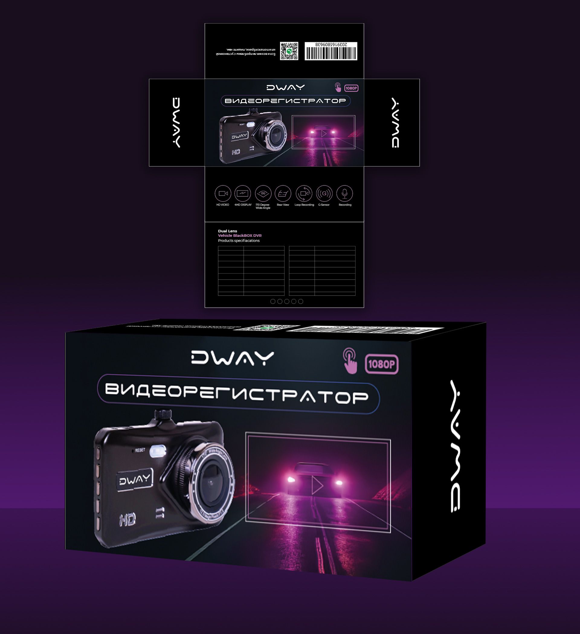 Черный фон больше нравится чем фиолетовый. Эта работа из ваших больше нравится. Но я бы не стали писаль- видеорегистратор и делать логотип на треть коробки