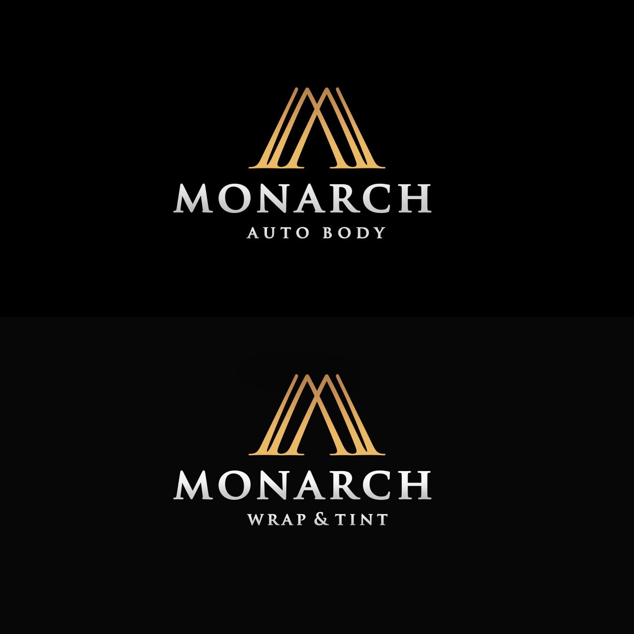Покажите вариант, где подписи "Auto Body" и "Wrap & Tint" набраны более современным и лаконичным шрифтом без засечек. Это может создать приятный контраст с основным названием. Сделайте линии в знаке буквы "М" чуть-чуть толще, чтобы они оставались четкими при значительном уменьшении логотипа.